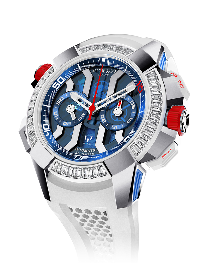 The Jacob & Co. × Messi collaboration (based on the EPIC X Chrono) centers on a blue and white Argentine color scheme + Messi’s personal symbol + a large-size, sporty-luxury style + high limited edition, maximizing recognizability and collectability.